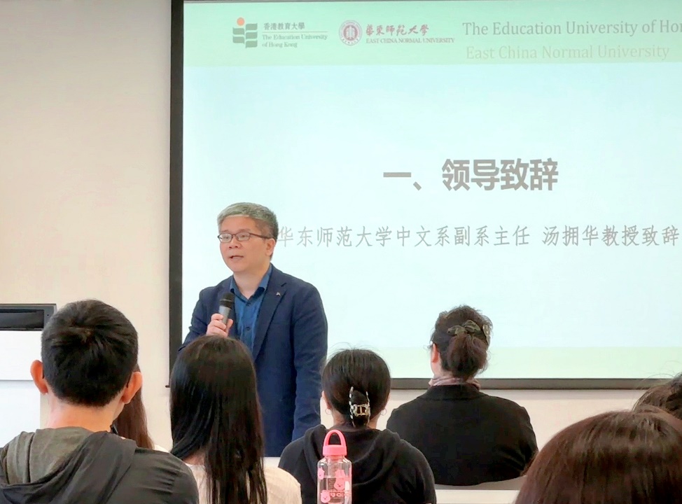 仪式伊始,副系主任汤拥华教授对香港教育大学同学的到来表示欢迎。汤老师表示老师们会积极帮助大家提高普通话水平,融入内地生活,期望同学们能设立目标,有计划与安排,在拼音正音、朗读说话等课程上上百分百投入,在沉浸式的普通话学习中提升自己,努力使普通话达到二甲水平甚至更高水平。同时,汤老师表示露出 会给大家提供各类资源,希望同学们能够用开放的心胸去体会与观察,鼓励大家借此机会就内地和香港中文教育教学的异同进行思考,展开调研。