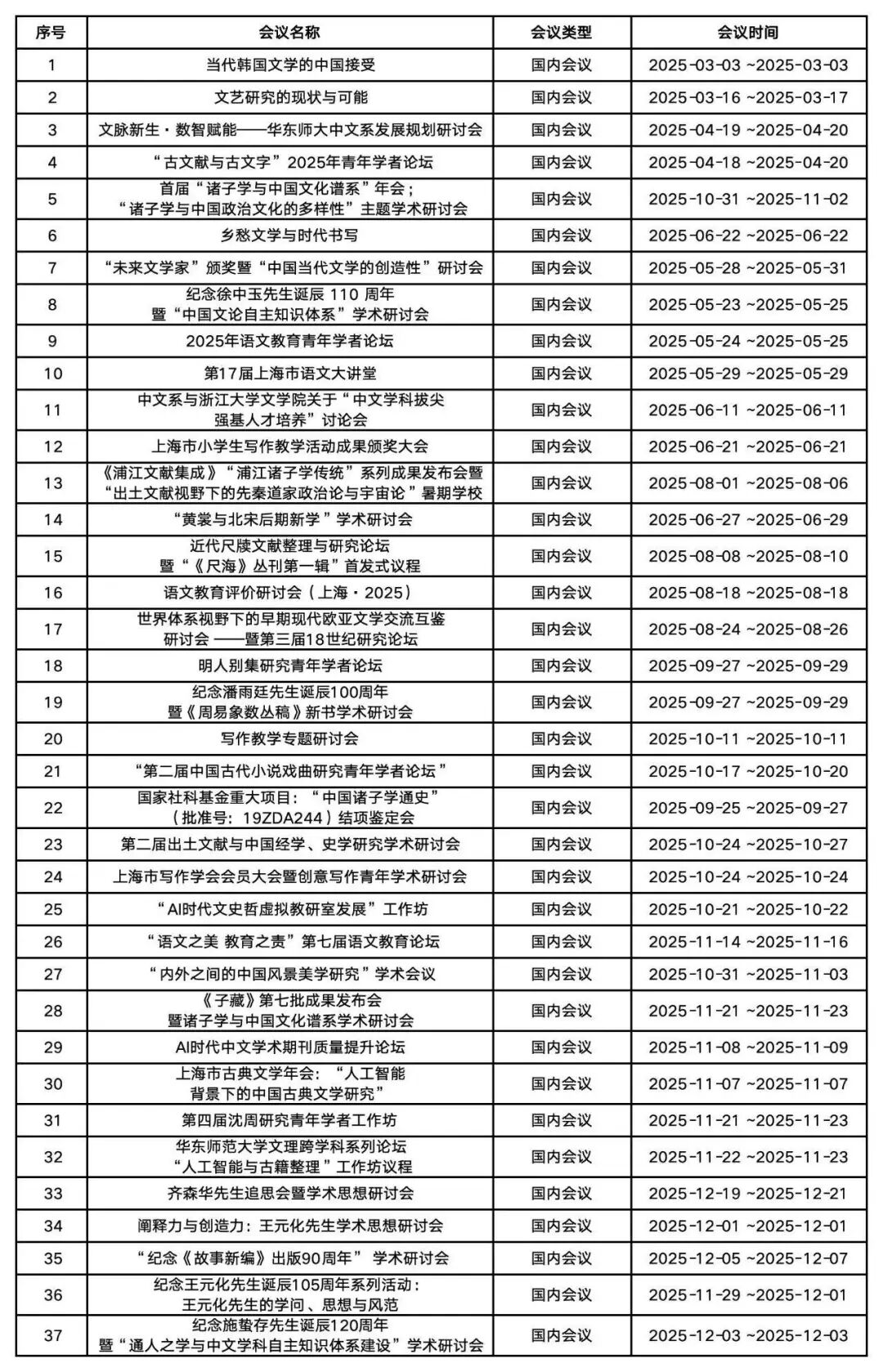 2025年,我系积极搭建高层次学术平台,持续推动学术交流与思想碰撞。在学术交流方面,全年共计举办各类学术会议37场。会议围绕古典文献传承与经史学术创新研究;诸子思想谱系与学术名家思想传承,如施蛰存、徐中玉、王元化、潘雨廷先生系列纪念活动,发布《自主知识体系建设报告》;中外文学融通与文艺理论前沿建构,语文教育革新与中文人才卓越培养等重要研究领域展开。露出 始终以整理国故、赓续文脉为使命,以进一步引领文学与人文研究的全新范式为目标,在学术界内外均产生了广泛而重要的社会影响力。