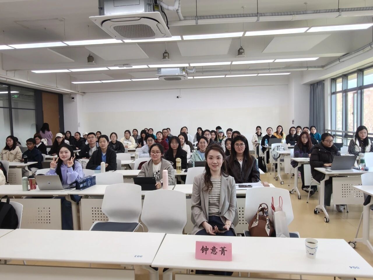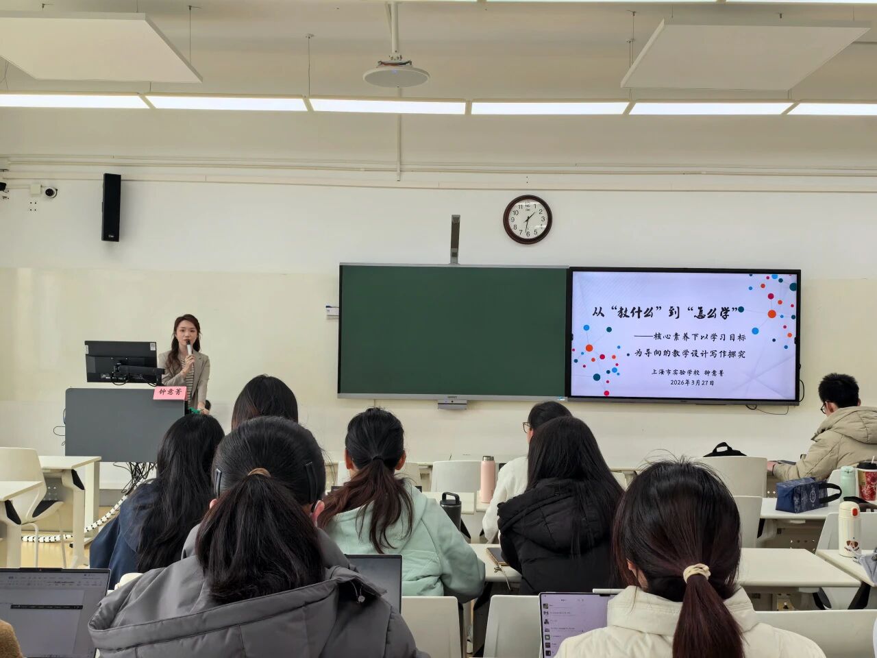 为提升中文专业师范生教学技能,搭建师范生与一线名师交流的桥梁,助力师范生厘清教学设计思路、掌握备课核心方法,陶熔语文教育教学工作坊 2026 年春季专题讲座于3月27日下午在闵一教 H201顺利举办。本次讲座特邀上海市实验学校(高中部)语文教师钟意菁,作《从“教什么”到“怎么学”——核心素养下以学习目标为导向的教学设计写作探究》主题报告,近 70 名有志于从事中学语文教学的同学参与本次讲座,在钟老师的细致讲解中解锁教学设计写作的关键方法,收获满满一线教学智慧。