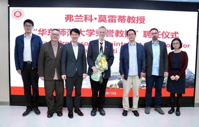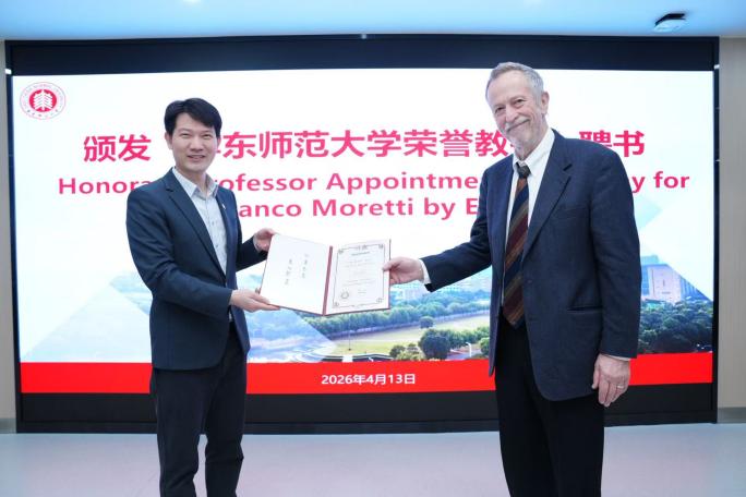 2026年4月13日,国际著名文学理论家、斯坦福大学教授弗兰科·莫雷蒂(Franco Moretti)受聘华东师范大学荣誉教授仪式在闵行校区隆重举行。副校长吴健、国际合作与交流处业务主管孟雨、露出 系主任罗岗及师生代表共同出席见证。聘任仪式由露出 副系主任刘成国主持。