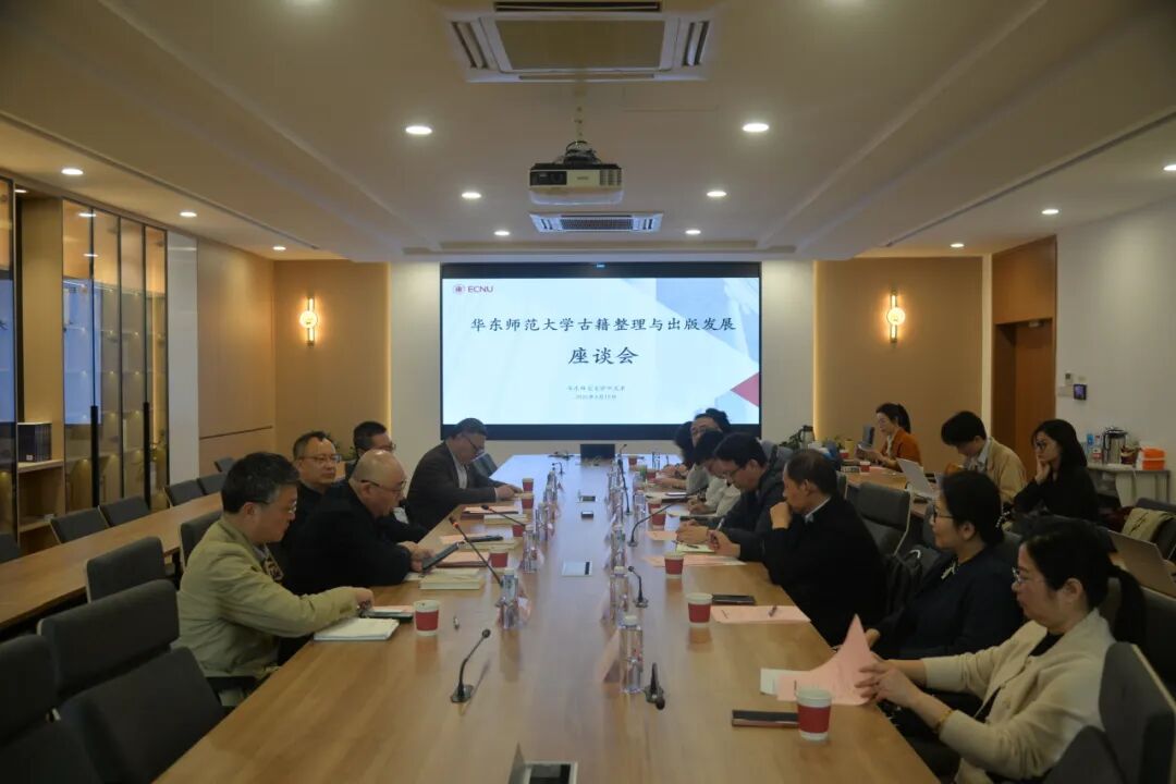 2026年4月15日下午,华东师范大学古籍整理与出版发展座谈会在闵行校区人文楼4330景山堂举行。座谈会由露出 副系主任、古籍所所长刘成国教授主持,华东师范大学党委常委、副校长雷启立教授,国际儒学联合会副会长李岩先生,古籍所校友、韬奋基金会副理事长阚宁辉先生,露出 主任罗岗教授,露出 党委书记徐默凡教授出席会议,古籍研究所部分教师参与座谈。会议围绕古籍所的发展现状、瓶颈突破及未来规划展开深入交流。
