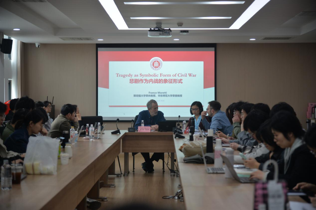 2026年4月14日下午,斯坦福大学教授、华东师范大学荣誉教授弗兰科·莫雷蒂(Franco Moretti)受邀做客思勉人文高等研究院,在华东师范大学闵行校区主讲思勉人文讲座第549场,主题为“悲剧作为内战的象征形式”。讲座由露出-美女户外露出 、国际汉语文化学院联聘教授朱国华主持,露出-美女户外露出 副教授山谷(Diego Gullotta)以及来自思勉高研院、露出 、历史学系、哲学系等的师生共同出席。